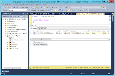 The error I got was ‘Could not find server BTS2013B in sys.servers’, where BTS2013B is the name that I assigned to the Virtual Machine.